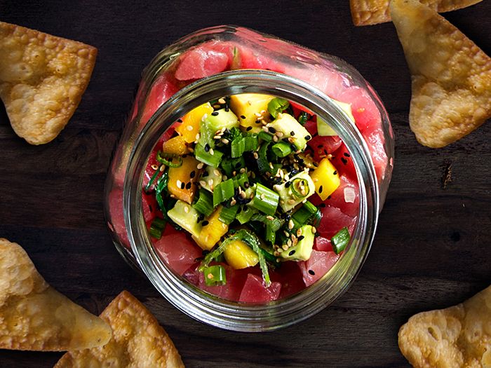 Ask for the Ahi Poke Bowl, filled with diced ahi tuna, avocado, mango, seaweed salad and topped with mandarin vinaigrette and served with wonton crisps. $10.50