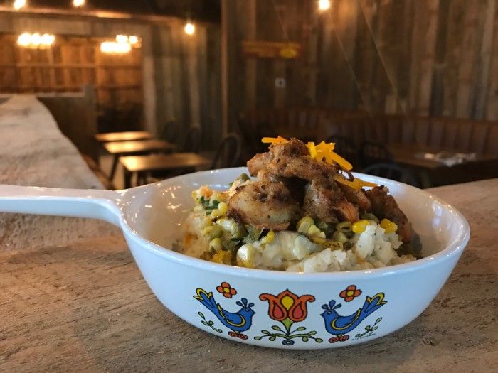 On the menu, you’ll find classic southern fare like shrimp and grits, fried green tomatoes and brunswick stew served up on mismatched thrifted dishes.