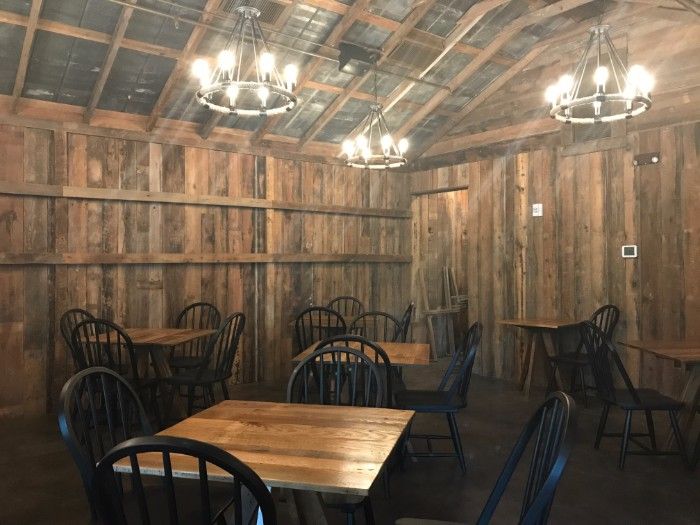 The restaurant feels like a barn with floor to ceiling reclaimed wood paneling and a dramatic canopy of tobacco baskets hanging from the ceiling.