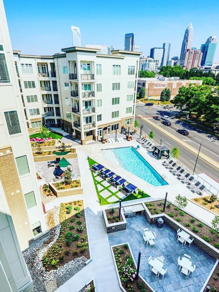 The developers of this community took full advantage of the location by placing the pool several floors above street level to fully enjoy the eastern views of the Charlotte skyline.