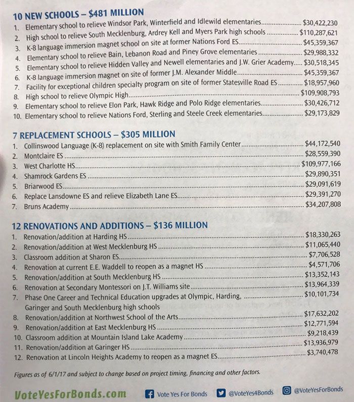 Schools to be replaced include West Charlotte High, Collinswood Language Academy and Montclaire Elementary. Renovations and additions will take place at Harding High, Sharon Elementary and East Mecklenburg High, among others.
