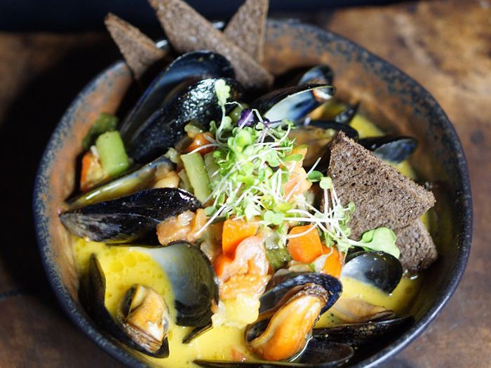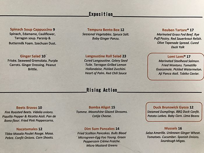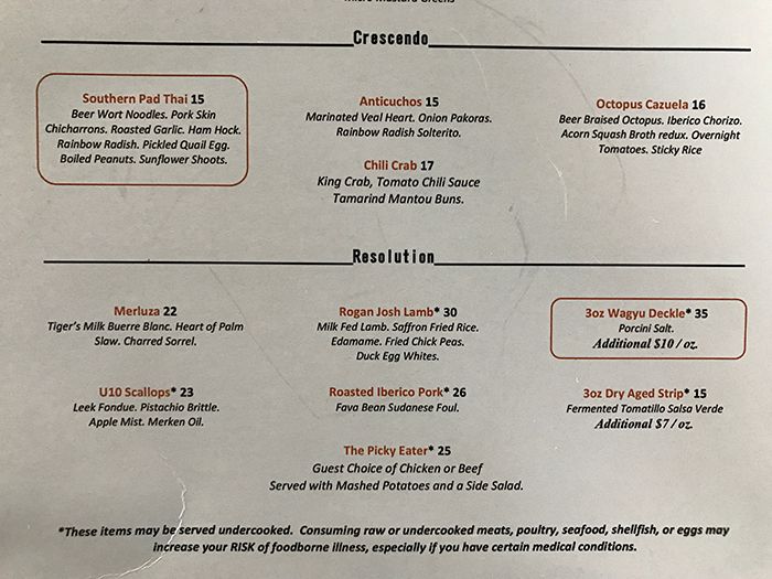 Think things like a Southern Pad Thai (beer wort noodles, pork skin, chicharrons, roasted garlic, ham hock, rainbow radish, pickled quail egg, boiled peanuts and sunflower shoots), Octopus Cazuela (beer braised octopus, iberico chorizo, acorn squash broth redux, overnight tomatoes and sticky rice) and Duck Brunswick Gyoza (steamed dumplings, BBQ duck confit, potato latkes, baby corn and lima beans).