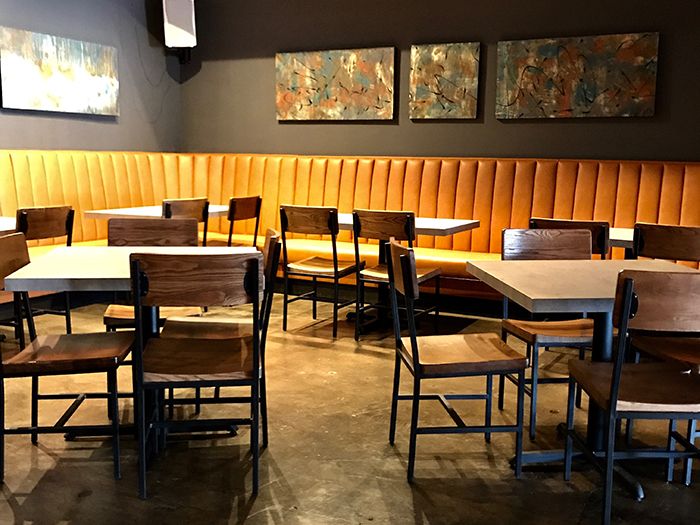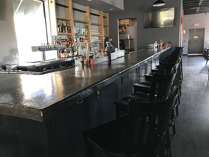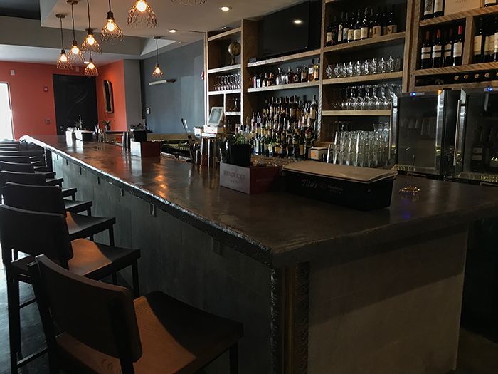 The restaurant is dark and cozy, with a poured cement bar, tables and booths.