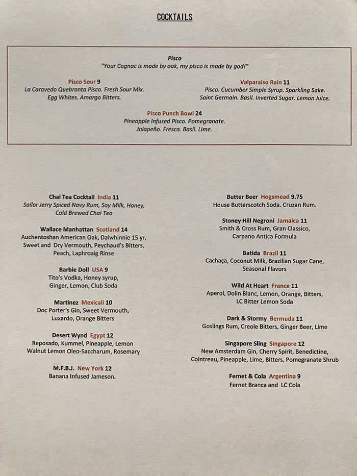 The drink menu features lesser-known international cocktails like a Singapore Sling and Pisco Sour.