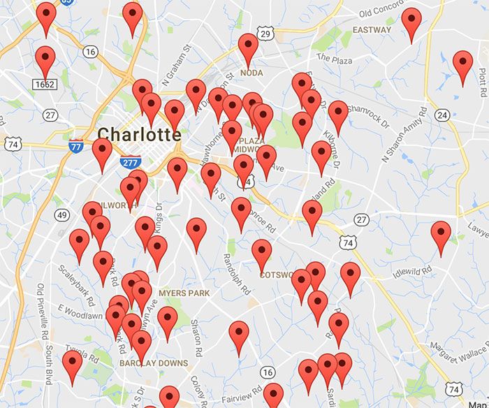 Most Little Libraries are concentrated in south Charlotte neighborhoods, such as Barclay Downs and Dilworth.