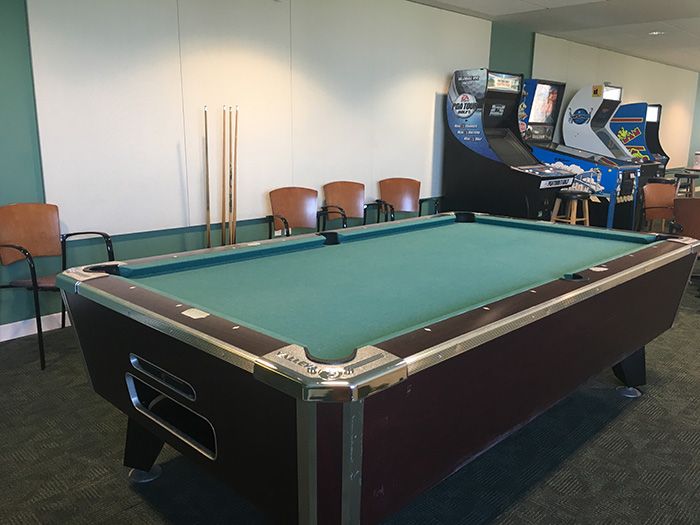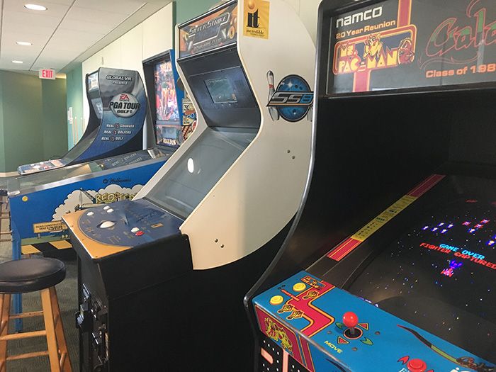 The upper balcony of the jury assembly room has a mini arcade, complete with Pacman, Galaga, pinball, PGA golf, a bowling game, and a pool table.