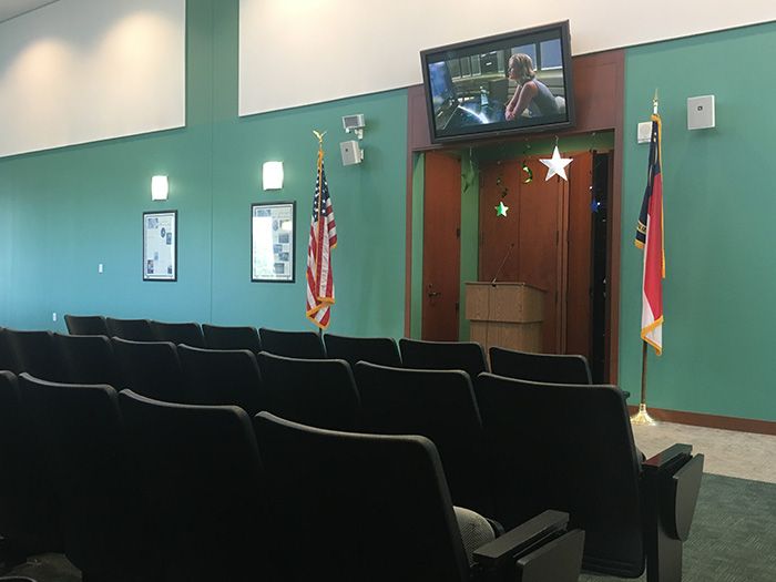 Justice Initiatives, a North Carolina nonprofit dedicated to improving citizen understanding and appreciation for the justice system, has provided a Netflix account to keep jury members entertained while they’re off duty. And I mean the old-school mail delivery Netflix, so there’s a wider range of movies to choose from. Movies are shown twice a day; when I visited, “Passengers” was playing.