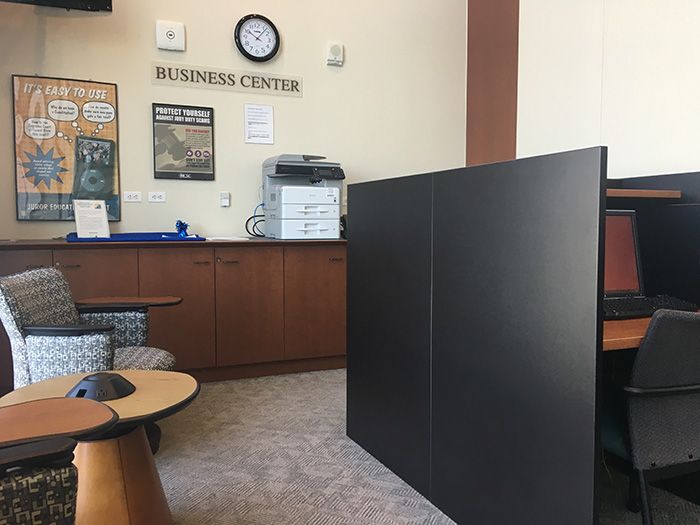 The business center has desktop computers that are free to use in case you don’t have your laptop, plus a fax machine and plenty of outlets with nearby seating.