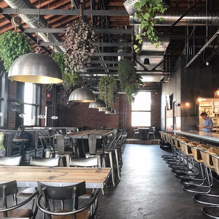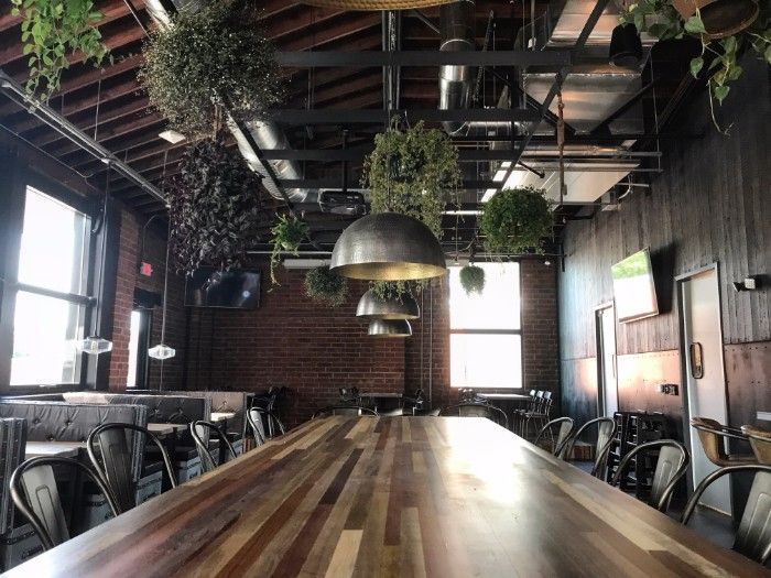 Inside, the main dining room is industrial but inviting, warmed up with lush greenery, custom wooden tables and leather seats.