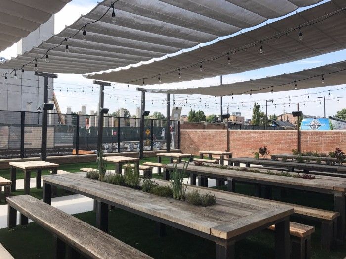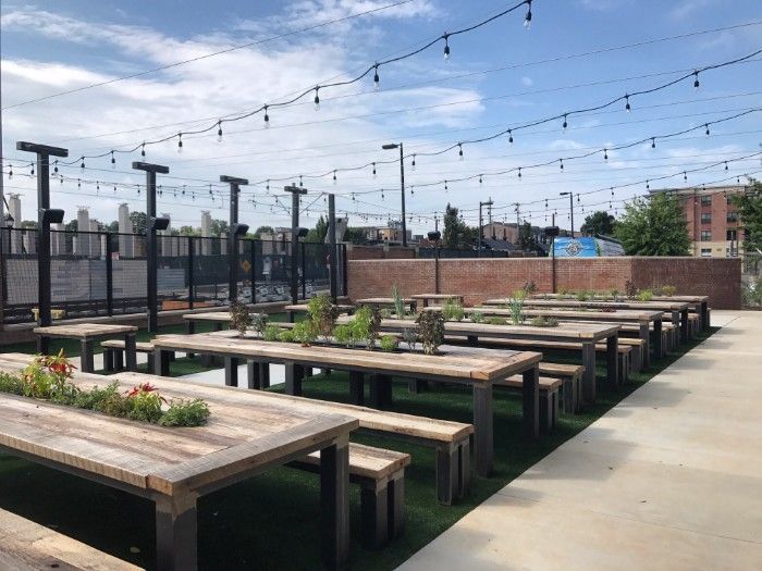 An expansive trailside patio features rows of picnic tables and retractable awnings to keep the space usable in both heat and rain.