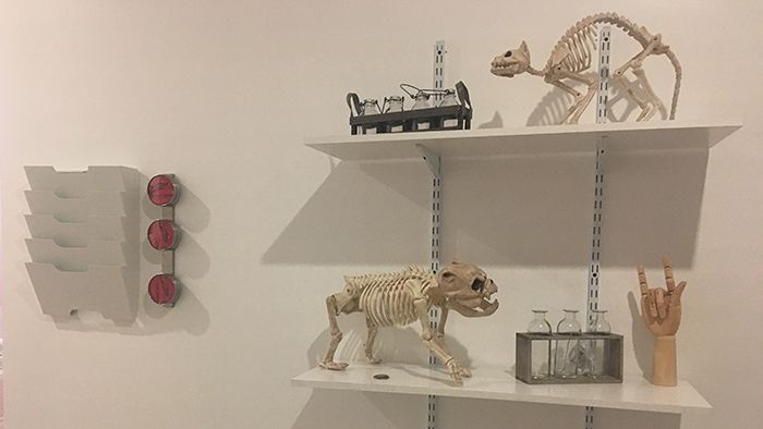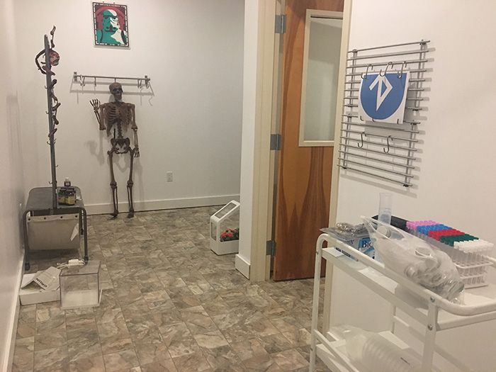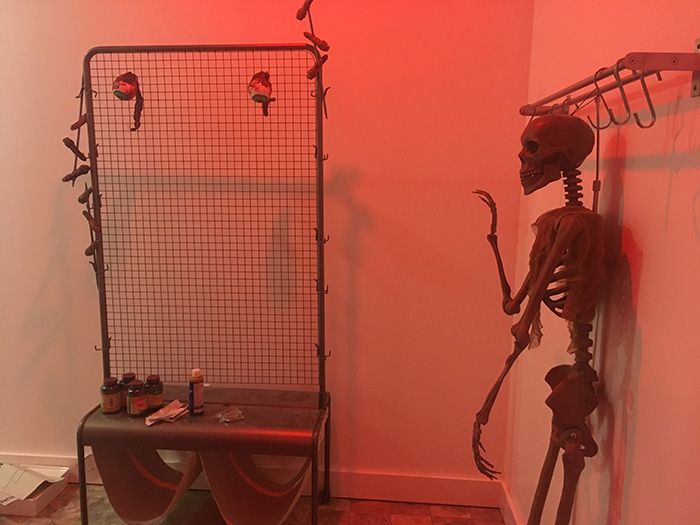 There are skeletons, beakers, test tubes, and fake eyeballs scattered throughout the Alpha-Omega Virus room.