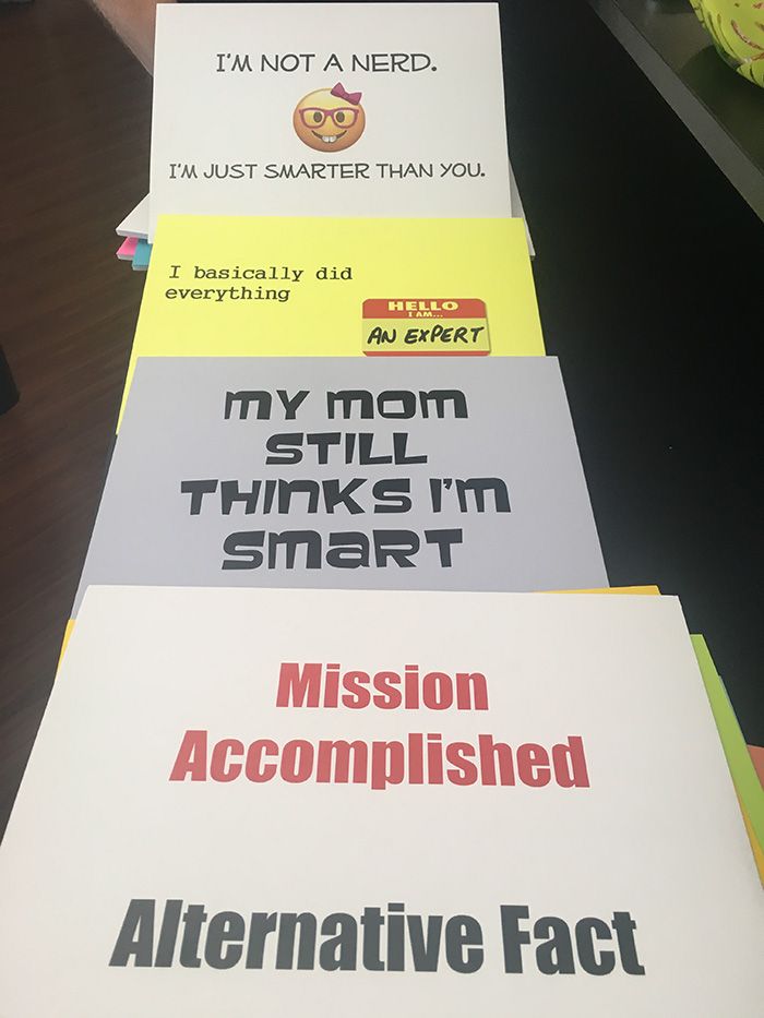 There are signs for people who do and don’t escape the room; my personal favorite is the “alternative fact” sign below.