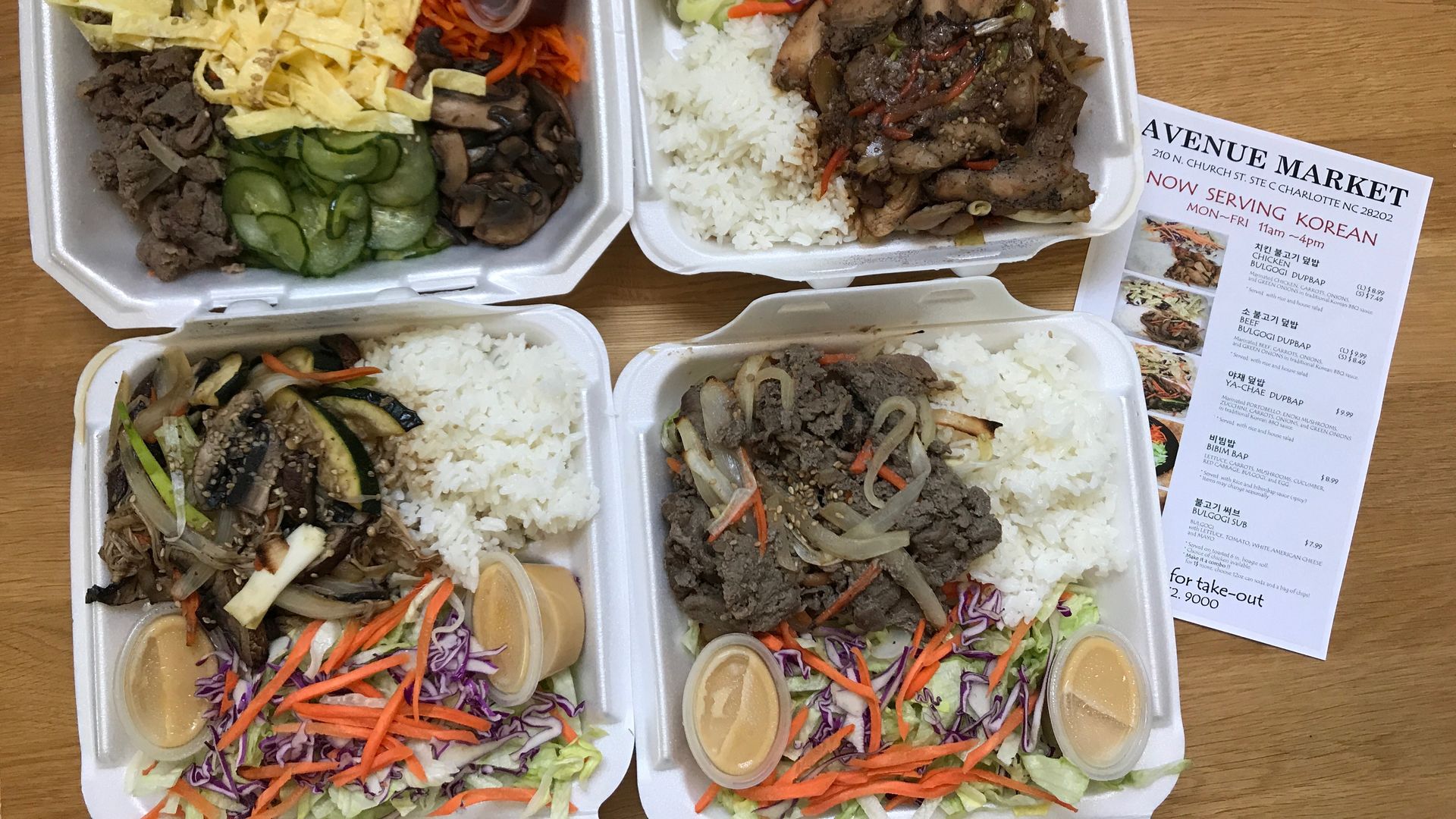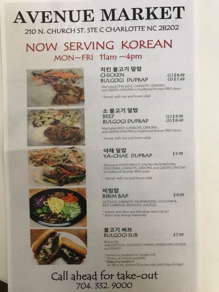 You’ll find Avenue Market at 210 North Church Street. The Korean takeout counter is open Monday through Friday from 11 a.m. to 4 p.m. The call ahead number is 704-332-9000.