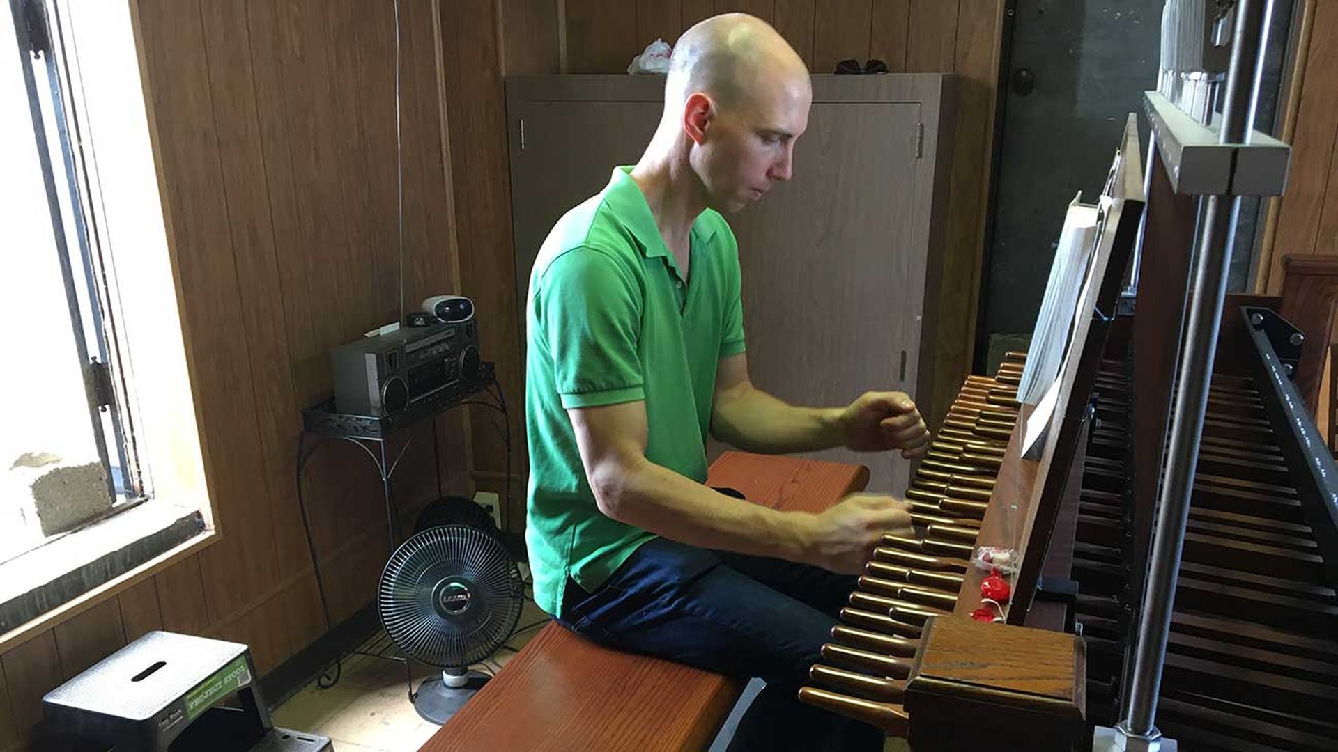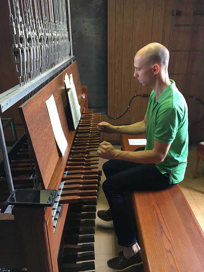 Despite the immense heat inside the bell tower the Sunday I went, Ben places a hymnal on the carillon and begins reading the music.