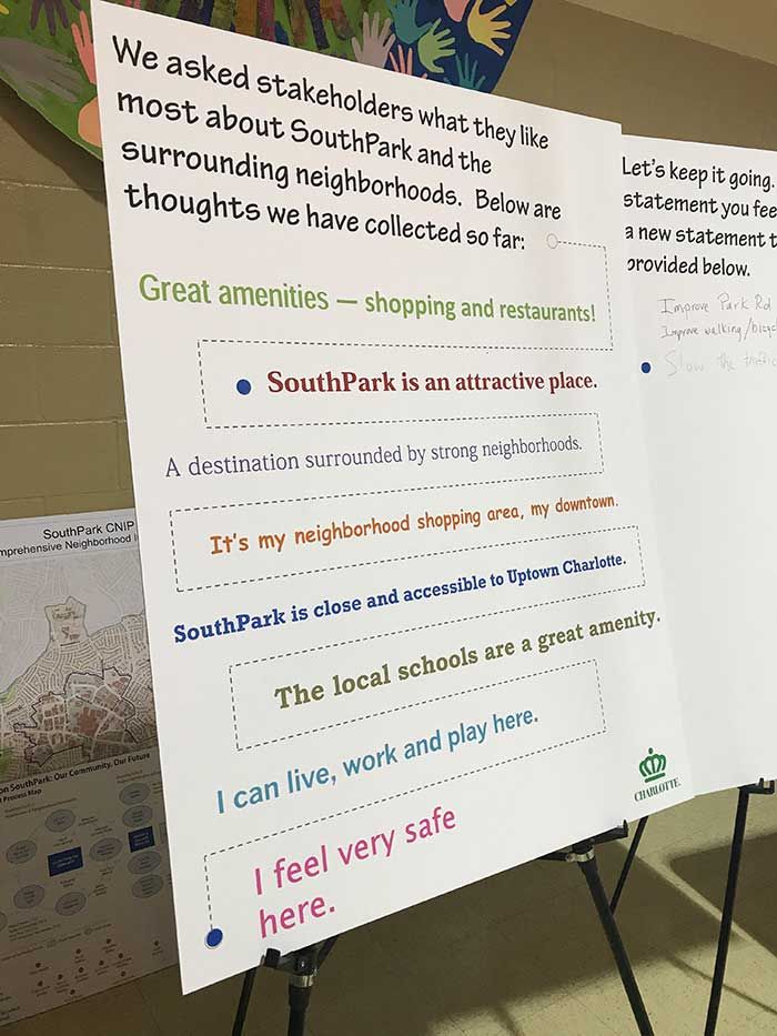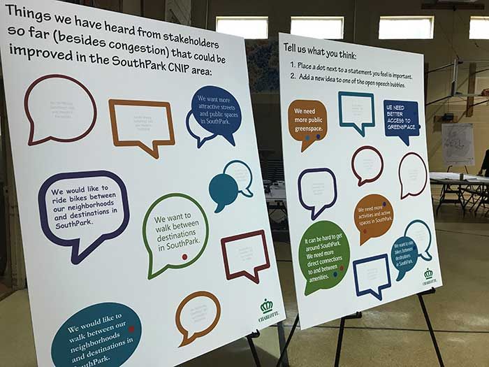 Proposals include adding bike lanes and bike stations around SouthPark. Others involve adding more sidewalks, improving intersections to make them easier to cross on foot, and making the streetscape more inviting.