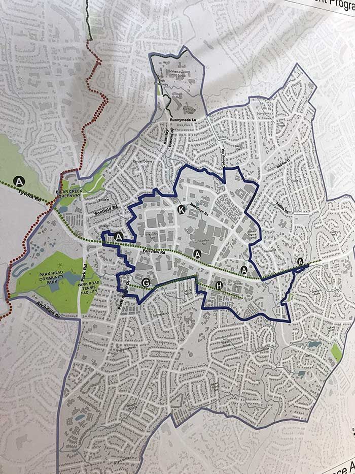 One proposal is to add a walking trail parallel to Fairview Road (A on the map below), and another on the south side of the Whole Foods (H and G).