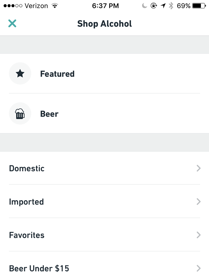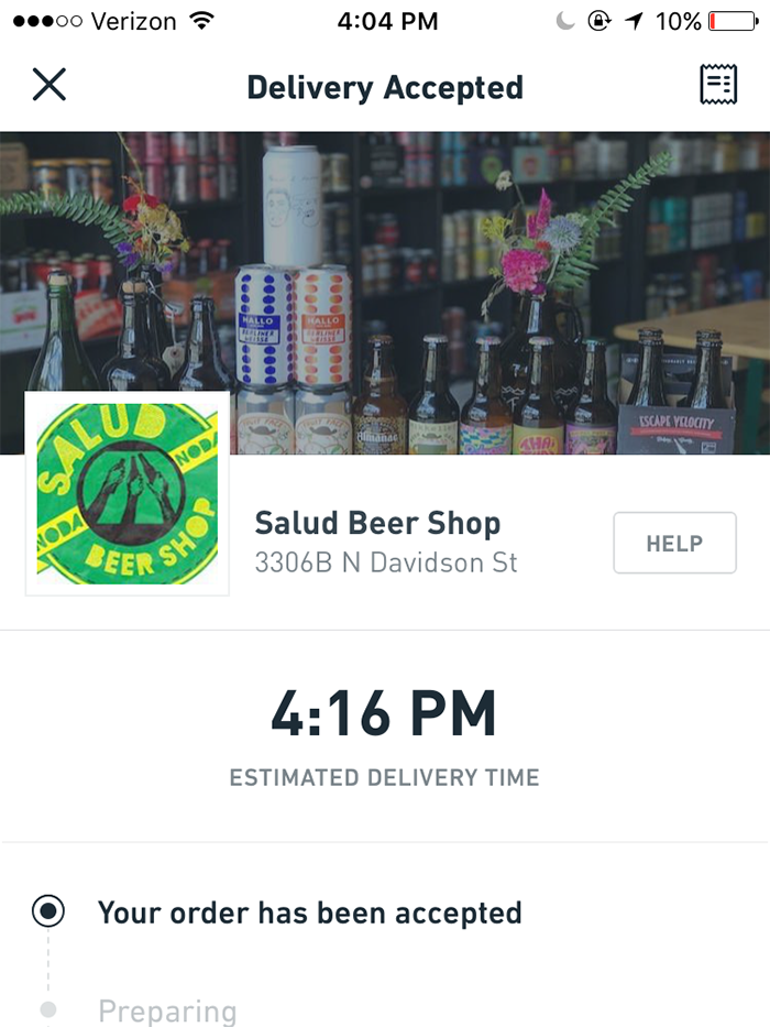 The DRINKS ordering process looks and feels the same as the food delivery portion of the app, and the beer comes from Salud in NoDa.