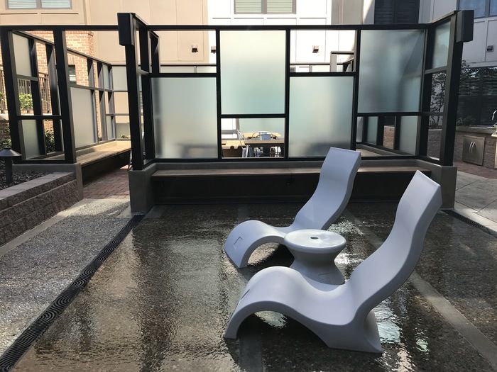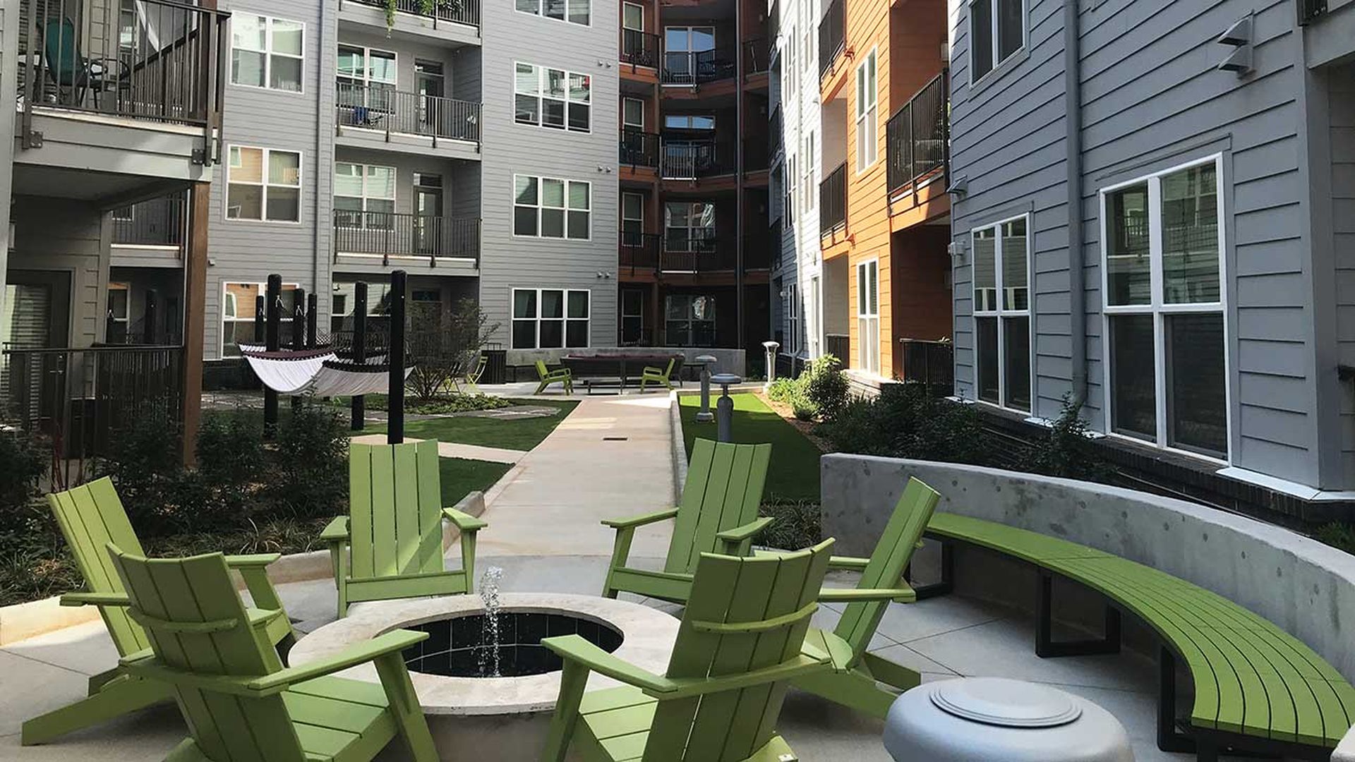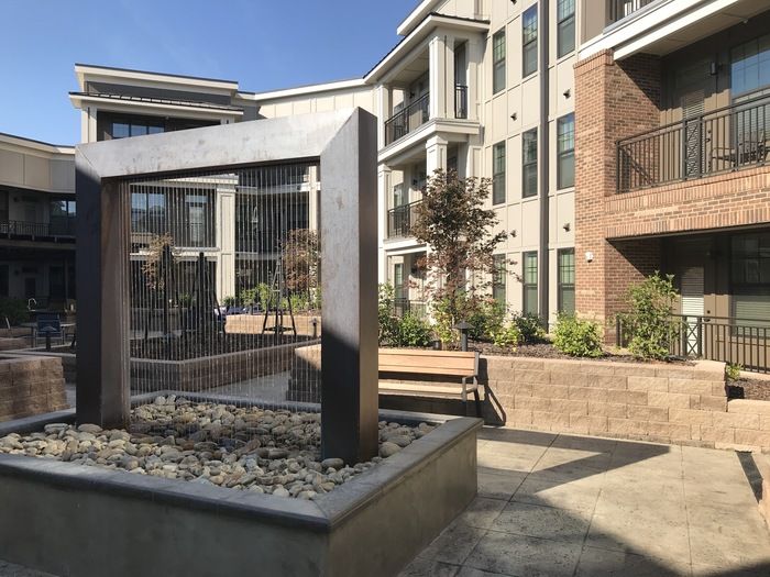 This private dining area and cool water feature at Lexington Dilworth. It’s on one of six courtyards at the apartment community.