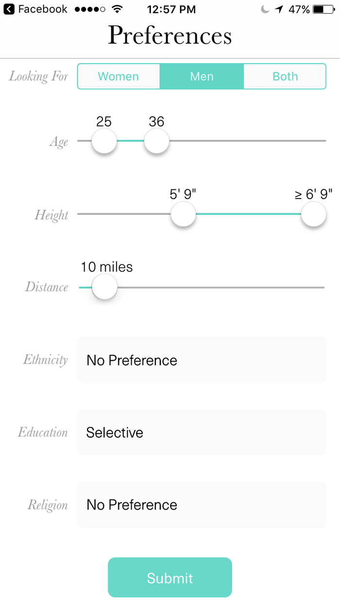 Preferences are highly specific, and include height down to the inch, education level, race and more.