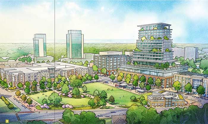 Towers at least 15 stories high along the light rail corridor. An attractive central park. Streets lined with shops and restaurants. A daytime office lunch crowd. The Atherton Mill smokestack emblazoned with lights.
