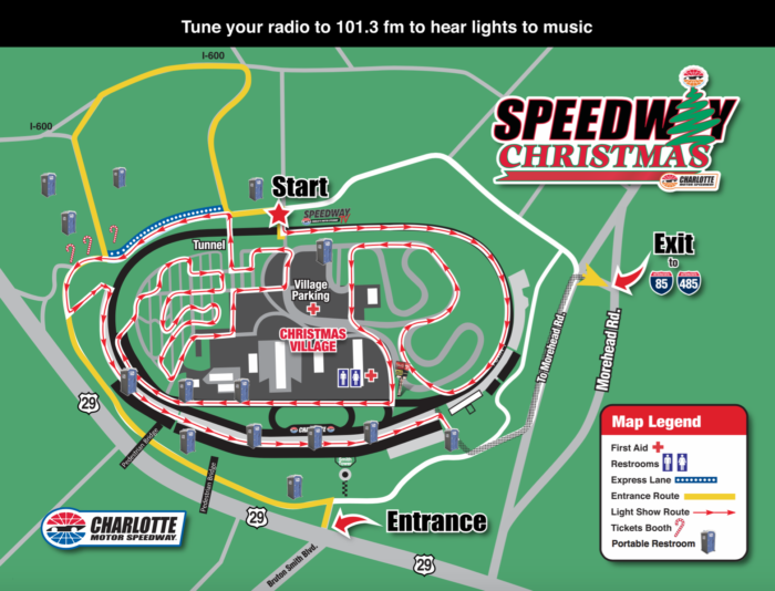 Speedway Christmas, a 3.5-mile drive-through holiday light display on the track at Charlotte Motor Speedway, is back for its 8th year. (Yes, you get to drive your car on the track!)