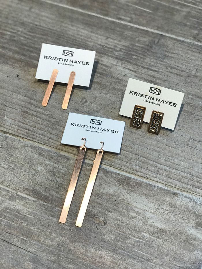 Look for Mignonne Gavigan bracelets ($35 each), shirts by Sundry (Star Pullover, $98, Leopard Babydoll, $80) and earrings by Kristin Hayes ($70-$95).