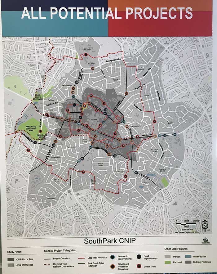 The city of Charlotte unveiled 45 pedestrian crossing, street improvement and trail projects on Tuesday that are under consideration for the SouthPark area.
