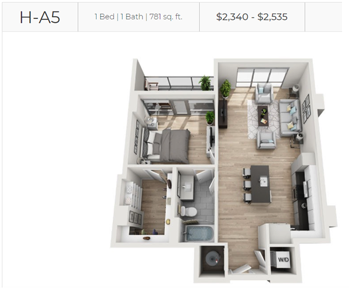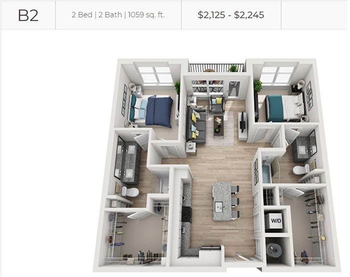 - Two bedroom (986-2,417 square feet): $2,098-$7,500