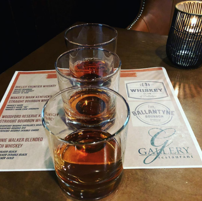 Sample whiskey flights at the Ballantyne Hotel – Gallery Bar features rotating daily whiskey flight selections. Stick around for dinner at Gallery Restaurant.