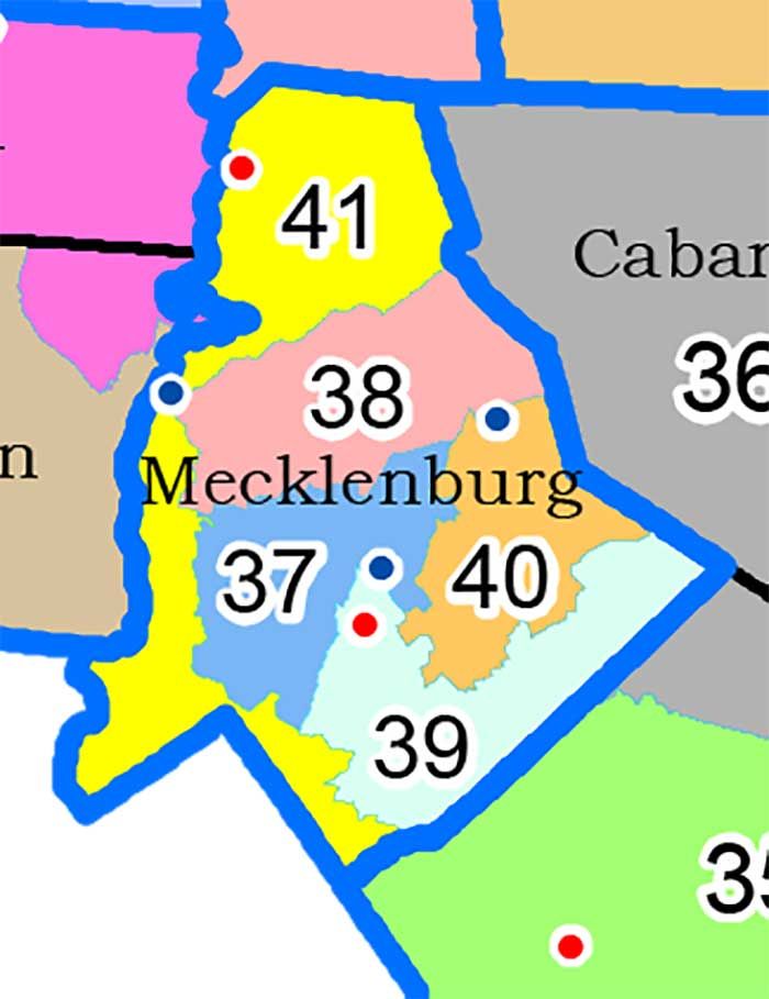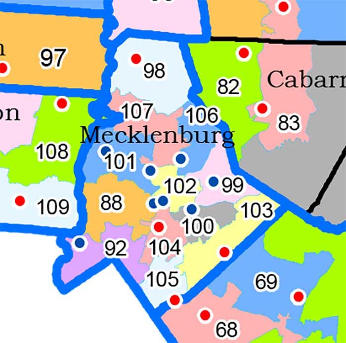 Here’s what the new lines for 2018 will look like. These were redrawn by the Republican-led state legislature in 2017. A “special master” (aka an independent elections expert) drew his own version of the state House maps by the courts didn’t choose to go with them for Mecklenburg County.