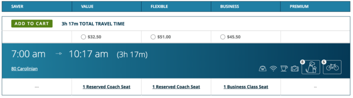 The price of your ticket varies depending on how far you’re going on the route and which class seat you want. For the full trip to Raleigh, coach seats are $32.50 – $39 one way and business class seats are $52 one way.