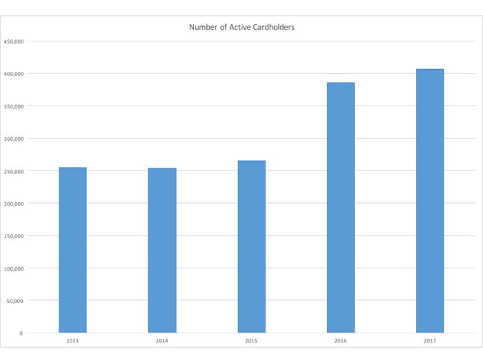 Despite the recent, somewhat tumultuous past, there’s been an overall steady rise in the number of active cardholders in the last 5 years.