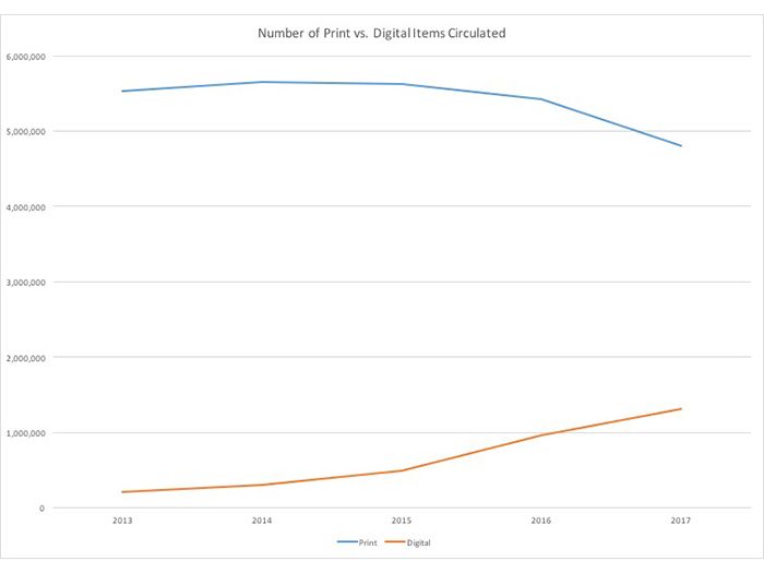In 2017, 4,799,023 physical items were checked out, down a small amount from 2013. The circulation of digital items, however, has skyrocketed in the last 3 years, surpassing 1 million last year.