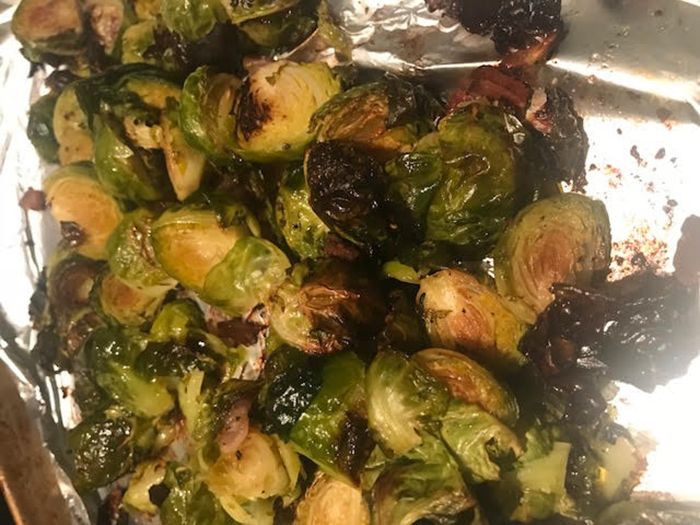 He goes to the annual HOA meeting (which was at Total Wine, with a wine tasting, so she saved herself and didn’t go) and she bakes chicken and brussels sprouts (with bacon) for dinner.