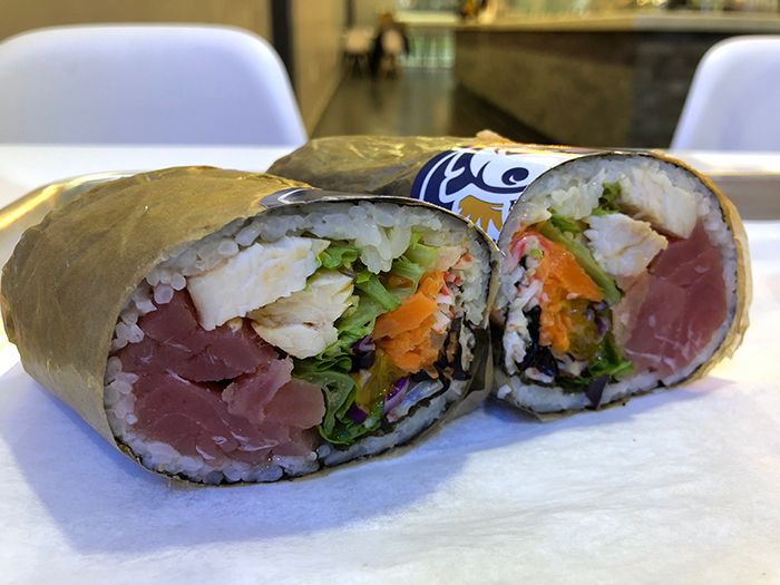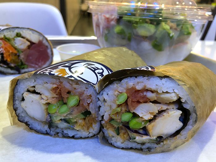 Choose your base (sushi or brown rice, burrito, or salad) and your protein (salmon, ahi tuna, spicy tuna, organic tofu, shrimp, chicken, char siu pork). Two proteins (regular) costs $8.95 while three (large) runs at $10.95.