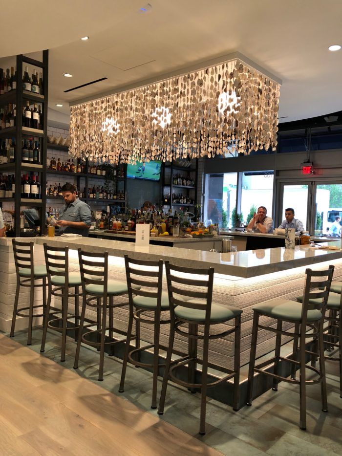 My favorite spot is the bar with its white subway tile and oyster shell chandelier.