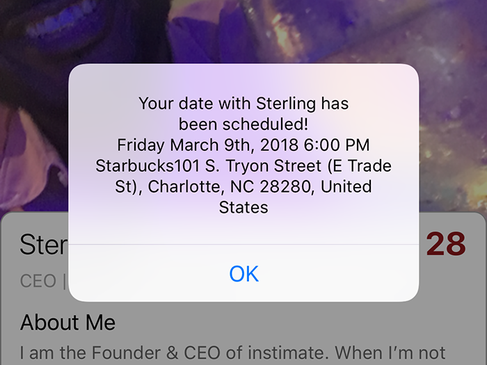 instimate, a Charlotte-based dating app that automatically plans dates for its users, now available in App Store