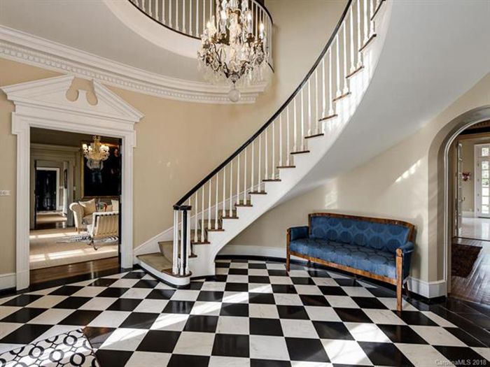 Per the listing, “Welcome to estate living on nearly an acre in the heart of Myers Park. 200′ of road footage, the only one on Queens Rd W. The grand 2-story foyer and spiral staircases set the stage for this elegant updated home, still with all of the traditional touches.”