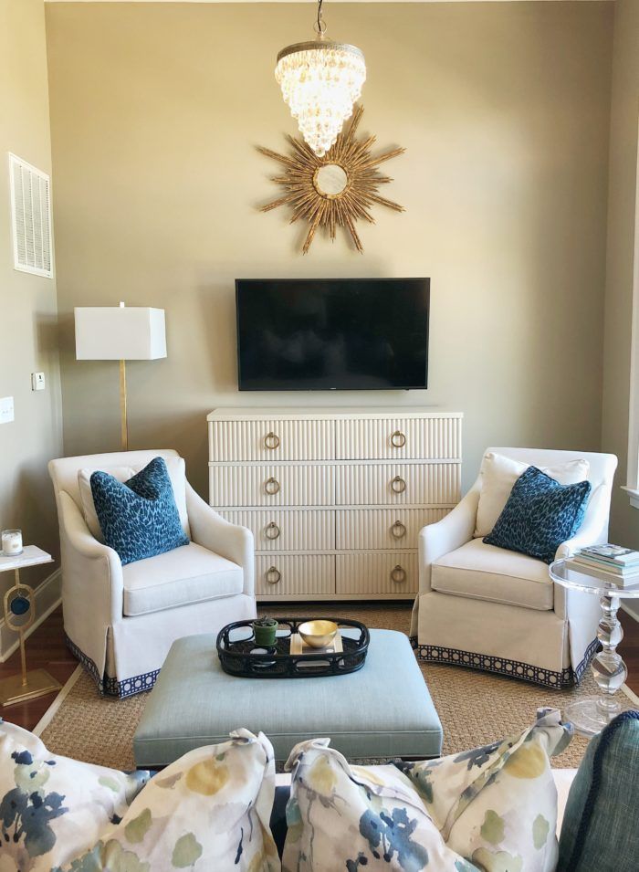 Fun fact: She nicknamed the two swivel chairs by her television Mary Kate and Ashley. “They’re by CR Laine and I got them on major clearance,” she says. “Shelby [my dog] perches on Ashley, so Ashley often gets covered with a blanket.”