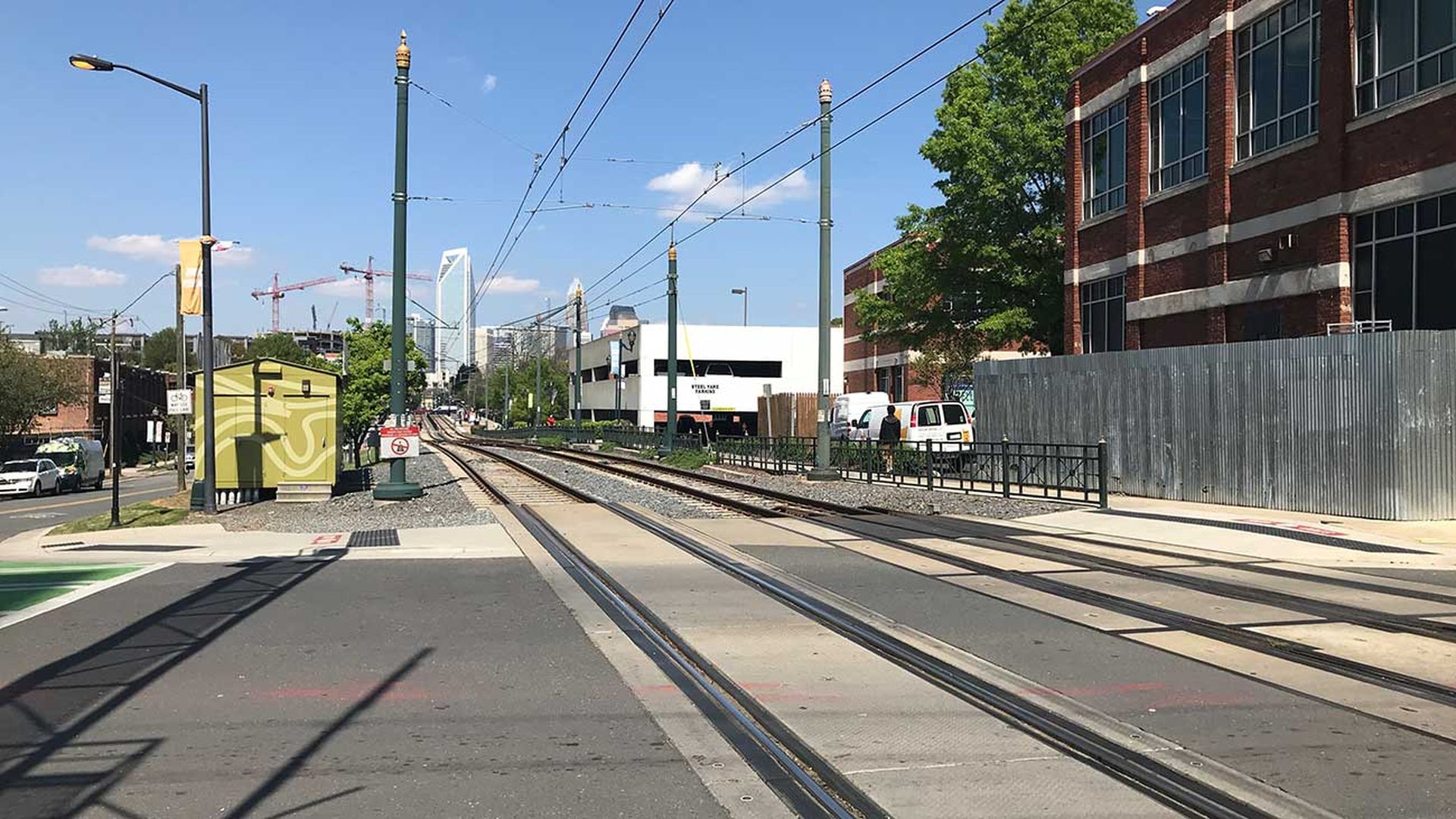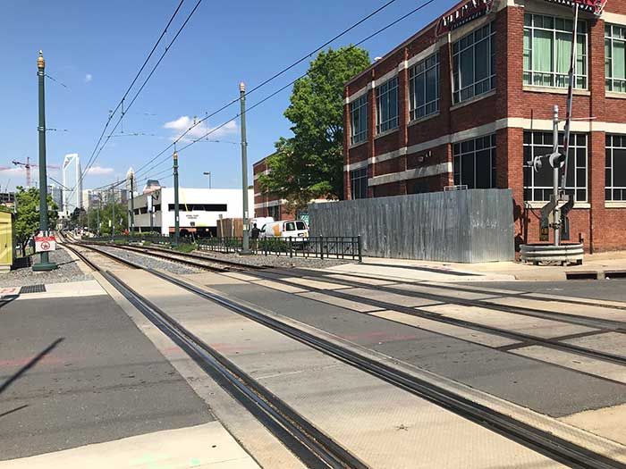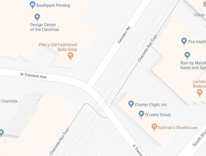 “It’s a lot better now than it was two years ago,” says Scott Curry, the department’s pedestrian planner. The big change was putting in the brightly painted green crosswalk. It’s a pilot for Charlotte’s “Urban Trail Street Crossing” program, an effort to make crossing roads more friendly for walkers and bikers.
