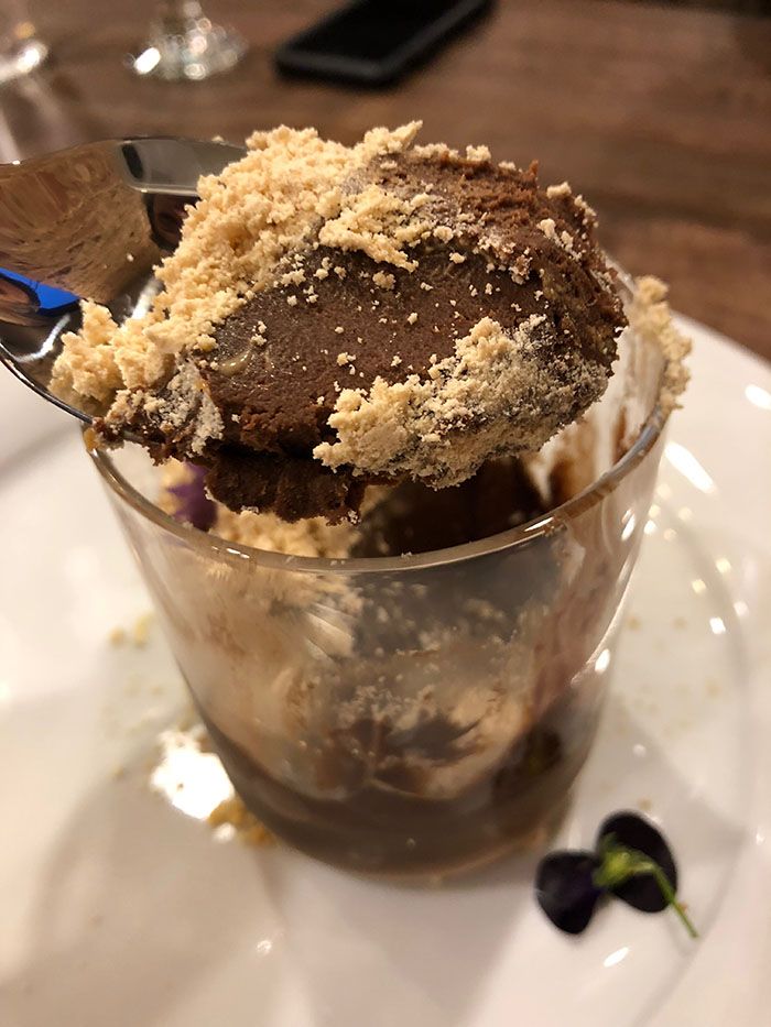 Peanut butter chocolate cup — dense, fudge-y chocolate ganache topped with defatted peanut flower that reconstitutes as a creamy spread in your mouth; like a fancy grown-up Reese’s cup you eat with a spoon