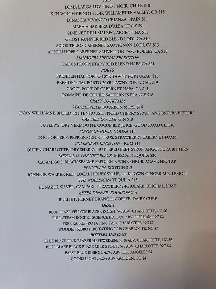 Look for local spirits like Doc Porter’s vodka from Charlotte, Muddy River’s Queen Charlotte Reserve rum from Belmont and Sutler’s gin out of Winston-Salem.