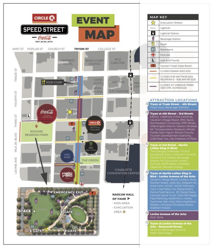 You won’t have to look hard to find Speed Street, as vendor displays, kids’ activities and all things NASCAR set up shop along Tryon Street beginning Thursday.