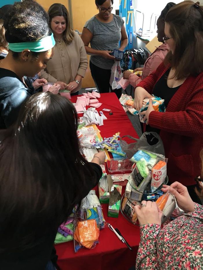 Today, Flo partners with young professional organizations, makes appearances at conferences and hosts packing parties during which 5 pads, 5 tampons and an insert listing refill shelters are packaged together and delivered to women throughout the city.