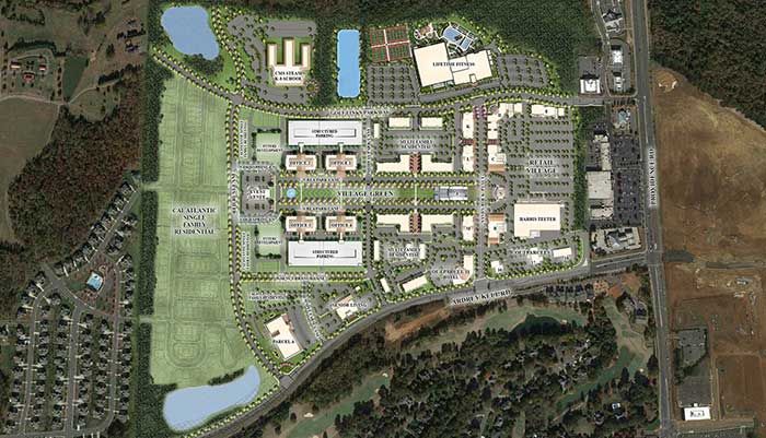 Most of the retail will revolve around a five-acre “Village Green,” a large green space headed by an event venue that will regularly screen movies when the weather’s warm. Think Symphony Park at SouthPark mall.