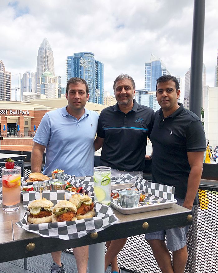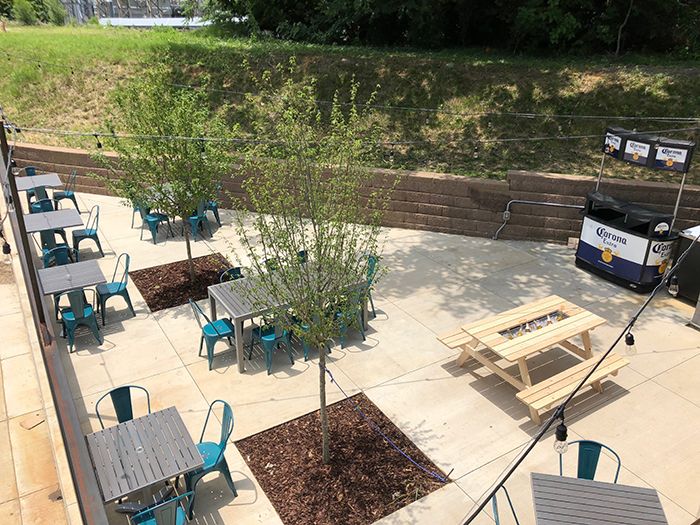 Outdoor patio – A triangular patio on the Panthers Stadium side of the building has a portable bar cart (so you don’t have to go inside or upstairs for a beer) and about 10 tables, including a picnic table with a built in ice trough you can stock with beer. (Side note: I love that they planted two trees on this patio.)