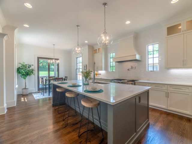 Tons of natural light, and a chef’s kitchen featuring custom cabinetry, quartz counter-tops, huge island and a gas range plus other details throughout like craftsman paneling and vaulted ceilings