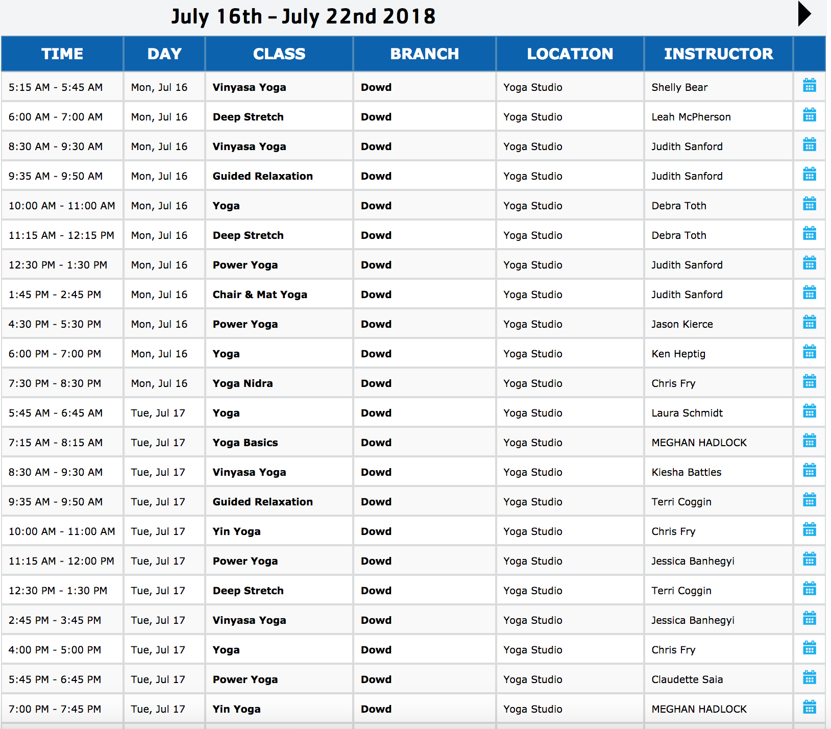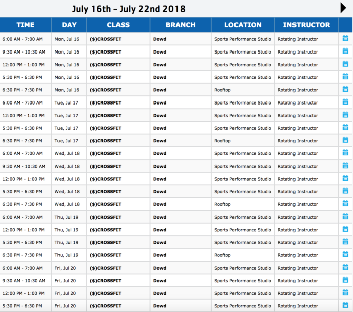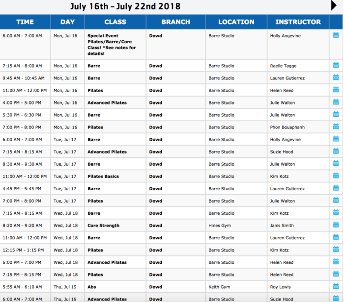 Click here to check the schedule for these offerings. Filter by branch (Dowd) and desired class (Yoga/Flexibility, Pilates/Barre/Core or $ PAID GROUP TRAINING for CrossFit).