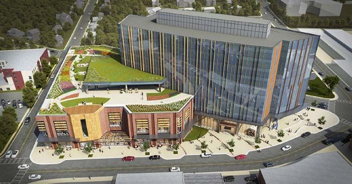 The project will feature a very similar format to RailYard, only a bit bigger. The complex will feature two towers, containing a total of about 400,000 square feet of office space, and a central square, ringed by 40,000 square feet of retail.