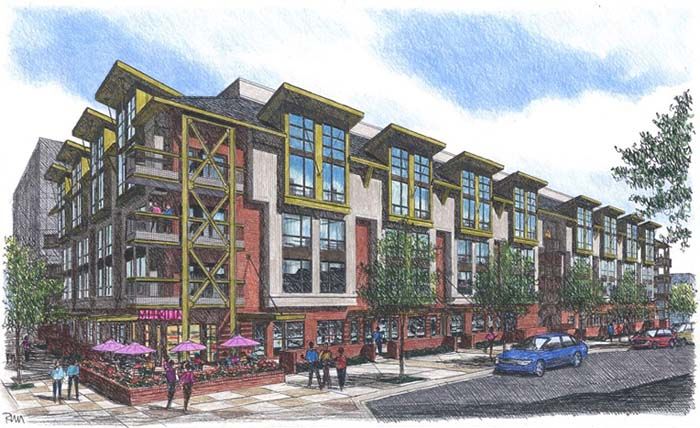 Screening the parking deck on three of the sides will be around 90 residential units, all 400 square feet or smaller. These micro-apartments might be tiny, but because of their size and bare-boned amenities, will have much lower rental prices than nearby apartment developments. The feeling is that South End has enough amenities on its own to satisfy young professionals, who need less and less space. The building is being developed by David Furman at Centro City Works.